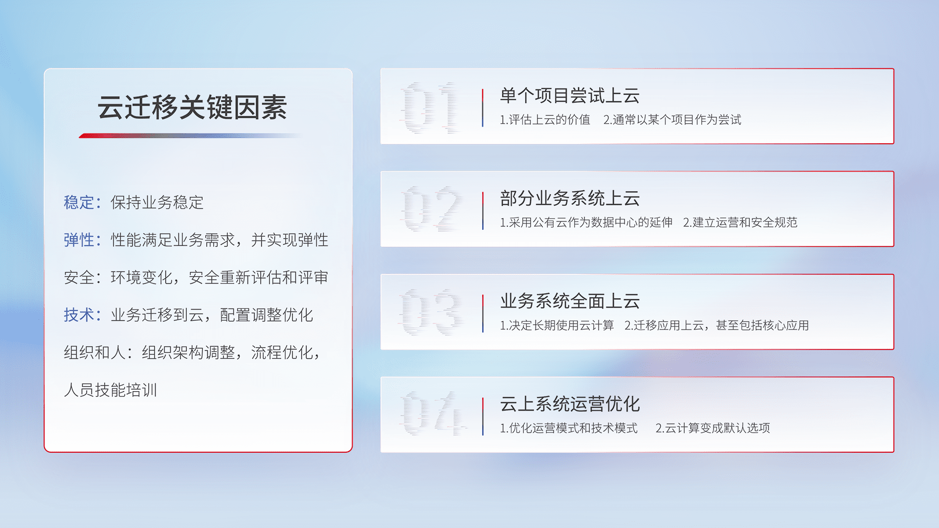 结合实际业务,,,,从规划设计、、、、云平台选型、、、、云原生改造、、、、数据迁移、、、、集成交付,,,,迁移全过程为客户识别最佳上云路径,,,,做好风险识别管理,,,设计网络架构、、、、身份权限、、、、安全审计合规、、、、操作审计、、、日志审计、、、监控告警策略、、多站点容灾设计等,,对云上基础设施进行整体规划,,提升IT治理水平,,以满足弹性、、、、高可用、、、、高性能的需求。。